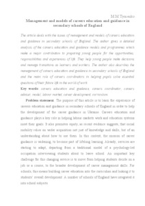 The article deals with the issues of management and models of careers education and guidance in secondary schools of England. The author gives a detailed analysis of the careers education and guidance models and programmes which make a major contribution to preparing young people for the opportunities, responsibilities and experiences of life. They help young people make decisions and manage transitions as learners and workers. The author also describes the management of careers education and guidance in secondary schools of England and the main role of careers coordinators in helping pupils solve essential questions of their future life in the world of work.