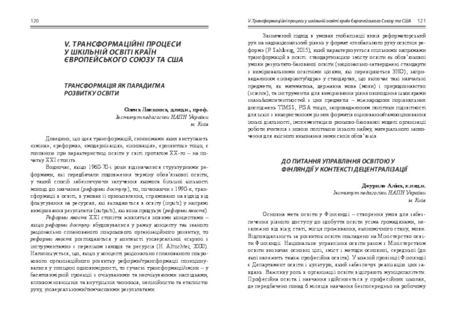 - Джурило, Аліна Петрівна (orcid.org/0000-0002-5129-6724) (2016) On the issue of education management in Finland in the context of decentralization In: Педагогічна компаративістика – 2016: освітні реформи та інновації у глобалізованому світі: матеріали наук.-практ семінару (Київ, 6 червня 2016 р.) . Педагогічна думка, м. Київ, Україна, pp. 121-125.