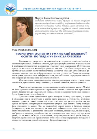 - Маріуц, Ілона Олександрівна (2015) Theoretical aspects of humanization of school education Український педагогічний журнал, 4. pp. 120-128. ISSN 2411-1317