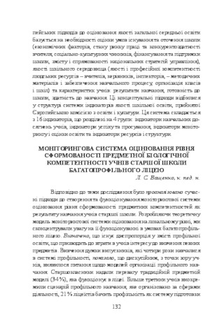 - Ващенко, Л.С. (orcid.org/0000-0002-0637-2142) (2015) Monitoring system for assessing the level of the subject biological competence of senior school students of a multi-discipline lyceum In: Анотовані результати науково-дослідної роботи Інституту педагогіки НАПН України за 2015 рік . Педагогічна думка, м. Київ, Україна, pp. 132-133. ISBN 978-966-644-398-5
