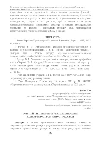 - Лукіна, Т.О. (orcid.org/0000-0002-3802-6666) (2018) Educational factor in the problem of ensuring the competitiveness of a specialist Підготовка конкурентоздатних фахівців: виклики сучасності: зб. матеріалів Всеукр. наук.-практ. конф. (м. Кривий Ріг, 25-26 квітня 2018 р.), 2. pp. 113-118.