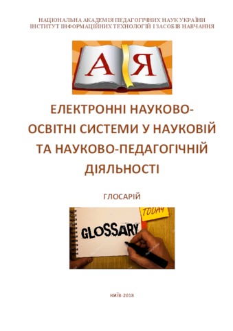 The glossary contains a list of basic concepts and terms related to the use of open electronic educational and scientific systems for the development of information and research competence of scientific and scientific-pedagogical workers, postgraduates and doctoral students. The concept is presented in alphabetical order in Ukrainian. An alphabetical index of terms and concepts is given. For scientific and pedagogical professionals', doctoral students, post-graduate students and all those who carry out research activities in the field of education science.