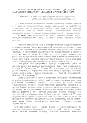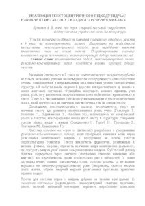 In the theses the peculiarities of learning the syntax of complex sentence in the 9th grade on the basis of competence are determined. The emphasis is placed on the need for a text-centric approach, which involves the study of linguistic themes based on the text. The system of complex exercises from the syntax is characterized, the criteria for choosing texts for them are determined.