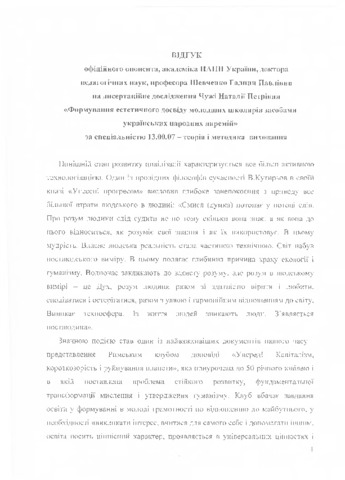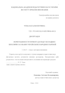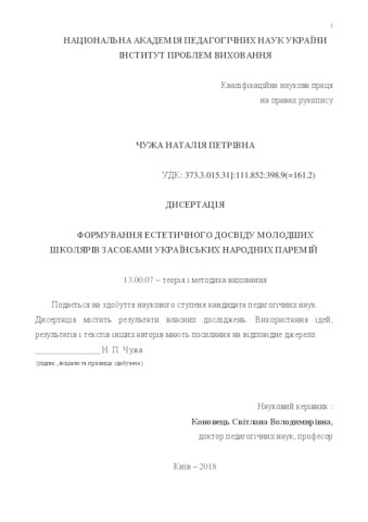 - Чужа, Н. П. (2018) Formation of Aesthetic Experience of Younger Schoolchildren by Means of Ukrainian Folk Paroemias Dissertation candidate thesis, Інститут проблем виховання.
