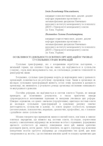 - Івкін, В.М. and Наливайко, Г.В. (2017) Distinctive features of educational organization’s work in conditions of social transformations In: Збірник тез ІІ Міжнародної науково-практичній конференції "Соціально-економічні та гуманітарні аспекти світових інноваційних трансформацій" , 1 . Навчально-науковий інститут менеджменту та психології ДВНЗ «Університет менеджменту освіти», м. Київ, Україна, pp. 66-68.
