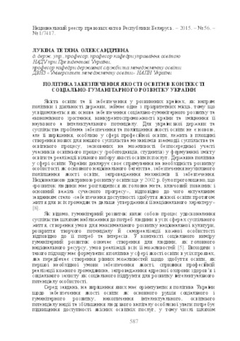 - Лукіна, Т.О. (orcid.org/0000-0002-3802-6666) (2017) The policy of ensuring the quality of education in the context of social and humanitarian development of Ukraine In: Проблеми управління соціальним і гуманітарним розвитком : матеріали 11-ої наук.-практ. конф. за міжнар. участю (м. Дніпро, 1 грудня 2017 р.) . ДРІДУ НАДУ, м. Дніпро, Україна, pp. 587-590.