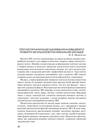 - Миньківська, М.В. (2014) Prognostic function of evaluation of innovative development of a general educational institution In: Анотовані результати науково-дослідної роботи Інституту педагогіки НАПН України за 2014 рік . Педагогічна думка, Київ, pp. 40-41. ISBN 978-966-644-398-5