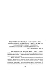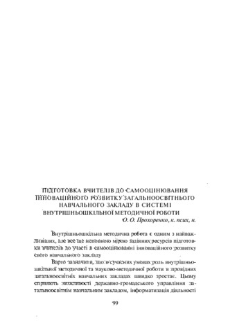 - Прохоренко, О.О. (2015) Teacher training for self-evaluation of innovative development of general educational institution in the system of in-school methodological work In: Анотовані результати науково-дослідної роботи Інституту педагогіки НАПН України за 2015 рік . Педагогічна думка, м. Київ, Україна, pp. 99-100. ISBN 978-966-644-398-5