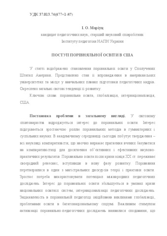 - Маріуц, Ілона Олександрівна (2017) Progress in comparative education in the United States Педагогіка і психологія, 3 (96). pp. 39-45. ISSN 2304-06294