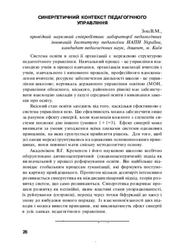 - Зоц, Віра Миколаївна (2014) Synergetic context of pedagogical management In: Збірник тез доповідей Всеукраїнської науково-практичної конференції з міжнародною участю «Управління інноваційним розвитком загальної середньої освіти в умовах соціально-економічної реформ» . Наші книги, м. Чернівці, Україна, p. 26.