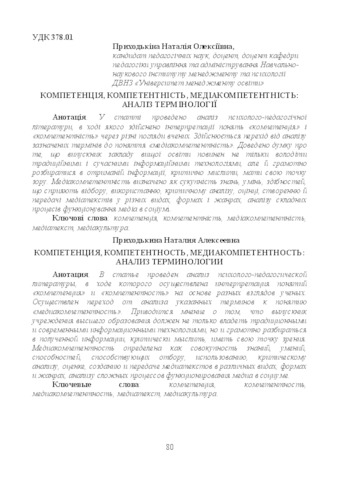 - Приходькіна, Н.О. (orcid.org/0000-0001-9965-6912) (2017) Competence, competence, media competence: analysis of terminology Вісник післядипломної освіти, 5 (34). pp. 80-88. ISSN 2218-7650