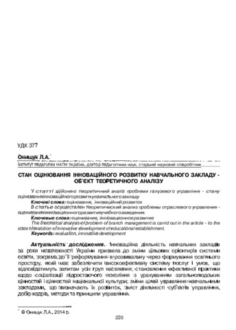 - Онищук, Людмила Анатоліївна (orcid.org/0000-0002-7854-9314) (2014) The state of evaluation of innovative development of an educational institution as an object of theoretical analysis Актуальні проблеми соціології, психології, педагогіки, 4 (25). pp. 220-226. ISSN 2311-214X