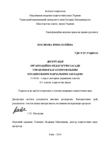 - Мосякова, І.Ю. (2018) Organizational-pedagogical principles of management of a multidisciplinary out-of-school educational institution Doctoral thesis, Черкаський національний університет імені Богдана Хмельницького.