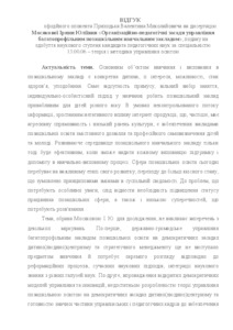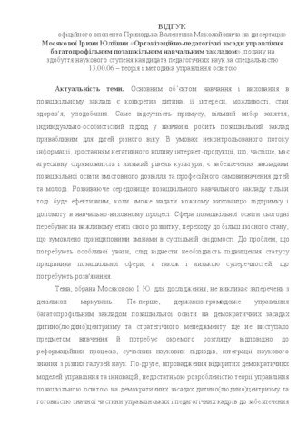 Organizational-pedagogical principles of management of a multidisciplinary out-of-school educational institution. – Qualifying scientific work on the rights of manuscripts. Thesis for Candidate’s Degree in Pedagogical Sciences in specialty 13.00.06 – Theory and Methods of Educational Management. – Institute of pedagogy of NAPS of Ukraine, Bohdan Khmelnitsky National University at Cherkasy of the Ministry of Education and Science of Ukraine, Kyiv, 2018. Thesis presents the socio-economic background of the emergence and development of out-of-school educational institutions in Ukraine, which determine the dynamics of the development of the first institutions of extracurricular education from the beginning of the twentieth century. Іn the context of cultural and educational work it is shown that during the first half of the last century the system of out-of-school education was finally formed, which provides the opportunity to stimulate and develop the abilities and interests of children in the field of art, painting, technology, tourism, physical education and sports, as well as identify types of institutions of extracurricular education – specialized and integrated (multiprofile), become constancy content and imperative-directive-unified forms of their work. It is noted that during the second half of the twentieth century, characteristic features of the modern institution of extracurricular education gradually formed as an object of strategic management. In thesis it is substantiated that the state of the normative-legal provision of the management of the institution of out-of-school education is considered at four levels: at the level of bodies of local self-government, bodies of state power, bodies of executive power; at the level of the institution of extracurricular education; at the level of the leaders of the circles; at the level of pupils, students and students of institutions of extracurricular education and their affiliates. In thesis the status of development of out-of-school educational institutions of an independent Ukraine and the classification of legislatively-normative base of out-of-school education are presented. It is exposed the normatively-legal and personnel support of institutions of out-of-school education and the problems of their functioning and development are shown. The basic concepts of research are specified, in particular: «out-of-school education», «multidisciplinary out-of-school educational institution», «organizational and pedagogical principles of management of multidisciplinary out-of-school educational institution»; conceptual provisions of organization of pre-vocational and vocational education in non-school educational institutions are substantiated. On the basis of the analysis of scientific works and practice of the management of out-of-school educational institutions, it became clear that domestic scientists pay much attention to the genesis of the development of out-of-school education in Ukraine, organizational and pedagogical and financial and economic problems of the functioning of the system and institutions of out-of-school education. However, the issues of organization of management of pre-vocational and vocational education in the conditions of out-of-school educational institutions, the system of management of out-of-school education, and the state and public administration of these institutions on the partner-confidence and democratic principles of the child (man) centrism are still insufficiently studied. The characteristic features of modern out-of-school educational institutions are determined as an open socio-pedagogical system, strategically oriented organization and object of management. Theoretical analysis of the author’s classification of the functions of management of socio-economic systems and their varieties – socio-pedagogical systems, which include out-of-school educational institutions, a definitive analysis of their concepts, allowed to determine the cycle of management of out-of-school educational institutions: planning, organization, motivation, analysis and control, management, coordination. The test of the effectiveness of the simulated system was carried out during experimental and experimental work. The legal and normative-guidance documents, according to which the management in out-of-school educational institutions of Ukraine is carried out is systematized, its personnel, organizational, educational-methodical, financial-economic, technical and technological support. The organizational foundations of the functioning of the multidisciplinary out-of-school educational institutions are substantiated: the organogram, the typical Statute taking into account the specifics, the statutes of the bodies of public governance and students’ self-government, the rules of the internal order of out-of-school educational institutions; Regulations on: Board of the institution, board of trustees, pedagogical council, organization of pedagogical activity and its effectiveness, the rules of internal order, schedule of classes, typical job placement instructions of employees and job description of the artistic director of the creative team, the function and duties of the participant of the experiment, the complex organizational mechanism, organizational culture; pedagogical principles of educational process management are defined: the educational program of , its essence and structure, educational programs for out-of-school educational institutions, the content of out-of-school education, pedagogical technologies. According to the results of the research, the model of the system of management of the multidisciplinary out-of-school educational institution based on the principles of the child (man) centrism is developed and scientifically substantiated and strategic management, in the correlation of its structural components, which are described in detail. In thesis theoretically substantiated methodological-targe