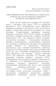 - Lazorenko, Borys (orcid.org/0000-0002-2113-0424) and Kalnytska, Kateryna (orcid.org/0000-0001-8713-7656) (2018) The Experience of Psychosocial Assistance School: Re-adaptation of Ukrainian Veterans and their Wives Психологічні науки: проблеми і здобутки, 1 (11). pp. 107-119. ISSN 2522-4093