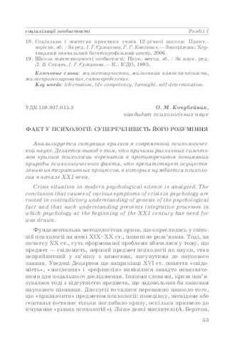 - Кочубейник, Ольга Миколаївна (2007) The fact in psychology: the experience of its acknowledgment Актуальні проблеми навчання та виховання людей з особливими потребами, 3 (5). pp. 53-63.