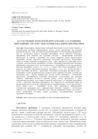 - Спірін, О.М. (orcid.org/0000-0002-9594-6602) and Головня, О.С. (orcid.org/0000-0003-0095-7585) (2018) Using Unix-Like Operating Systems Virtualization Technologies in Training the Bachelors of Computer Science Information Technologies and Learning Tools, 3 (65). pp. 201-222. ISSN 2076-8184
