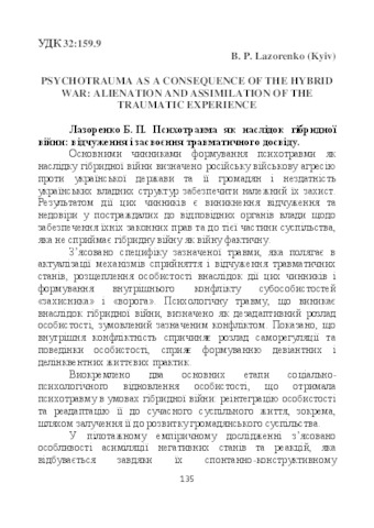 - Лазоренко, Борис Петрович (orcid.org/0000-0002-2113-0424) (2017) Psychotrauma as a consequence of the hybrid war: alienation and assimilation of the traumatic experience Психологічні науки: проблеми і здобутки, 1 (10). pp. 135-148. ISSN 2522-4093