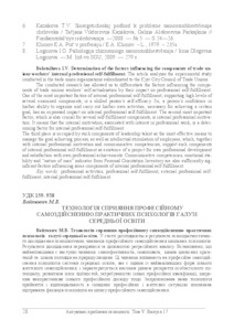 The article deals with the results of psychodiagnostic research of psychological factors of school psychologists’professional self-realization. The results of the study were verified using regression analysis. The following factors are found to be the most important ones: self-efficacy, self-esteem, scale of value-based orientations, and scale of views on human nature. These factors influence the professional self-realization of psychologists in the system of secondary education, which is one of the most important forms of their personal self-fulfillment, and is characterized by high level of disclosure of personal potential, development of their abilities, the demand for their professional qualifications, the extensive use of their professional experience, etc. Our proposed technology of acceptance and responsibility in complex professional and life situations is intended to support psychologists on the path to professional self-realization. Prospects for further research are the development of a detailed program of practical trainings in order to master the technology of acceptance and responsibility for promoting professional self-realization of psychologists in secondary education.
