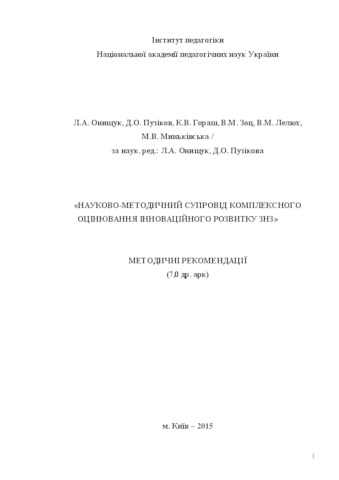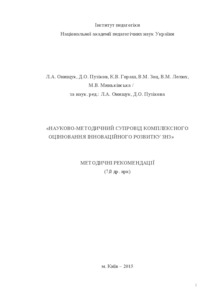 - Онищук, Людмила Анатоліївна (orcid.org/0000-0002-7854-9314), Пузіков, Дмитро Олегович (orcid.org/0000-0003-2630-6924), Гораш, Катерина Вікторівна (orcid.org/0000-0001-8625-9774), Зоц, Віра Миколаївна, Лелюх, В.М. and Миньківська, М.В. (2015) Scientific and methodological support of complex evaluation of innovative development of general educational institution: methodical recommendations [Teaching Resource] (In Press)
