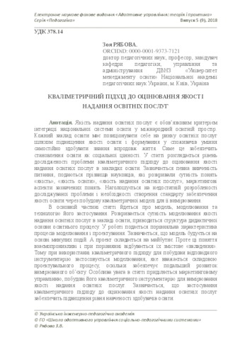 - Рябова, З.В. (orcid.org/0000-0001-9373-7121) (2018) Qualimetric approach to evaluating the quality of the provision of educational services Адаптивне управління: теорія і практика. Серія «Педагогіка», 5 (9). pp. 1-20.
