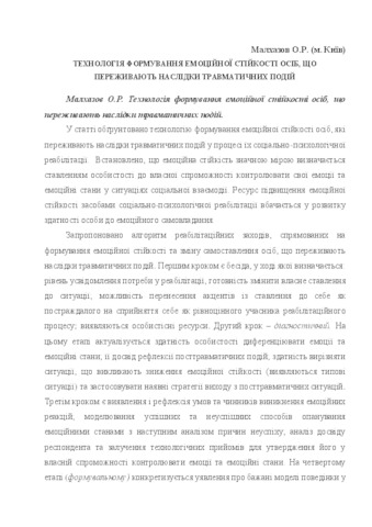 The article explains technology of shaping emotional resilience of patients who are going through the consequences of traumatic events in the process of their socio psychological rehabilitation. The article detects that emotional resilience is largely defined by how personality relates to her own ability to control emotions and emotional states in situations of social interaction. Resource of increase of emotional resilience is seen in development of one’s ability of emotional self-control. The article offers an algorithm of rehabilitation means that are aimed at shaping of emotional resilience and change in self-confidence of the persons who are going through the effects of traumatic events. First step is a conversation that aims to find out the following: level of self consciousness regarding the need for rehabilitation; readiness to change her own attitude towards the situation; possibility of change of the accents – from treating oneself as a victim to perceiving oneself as an equal participant of the rehabilitation process. Also, personality resources are revealed. Second step is diagnostic. This stage actualizes the ability of the personality to differentiate emotions and emotional states; her experience of reflection on posttraumatic events; ability to distinguish situations that cause decrease in emotional resilience (typical situations are revealed) and applying available strategies for escape from posttraumatic situations. Third step is detection and reflection of conditions and causes of the emergence of emotional reactions; modeling successful and unsuccessful methods of managing emotional states with following analysis of the reasons for failure; analysis of respondent’s experience and engagement of technological methods to increase her confidence in her own ability to control emotions and emotional states. At the fourth stage (formation), the image of desired models of the respondent’s behaviour in emotionally significant situations is specified and necessary abilities and skills of emotion correction are defined; rehabilitation techniques and technologies of enhancing confidence in one’s ability to control emotional states are applied; ability to anticipate situations that cause decrease of emotional resilience and choose optimal behaviour model (avoidance, solution, changing of attitude towards the situation, suppression or depreciation of the situations that cannot be solved) is developed.