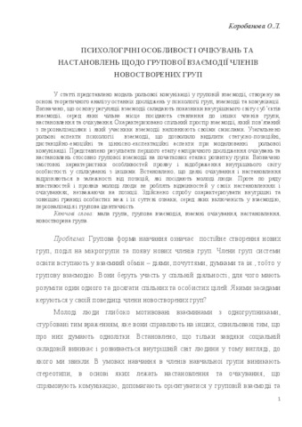 - Коробанова, О.Л. (orcid.org/0000-0003-3539-871X) (2016) Psychological features of expectations and attitudes regarding interaction of group-members of the newly-formed groups Наукові студії із соціальної та політичної психології. ISSN 2309-8287