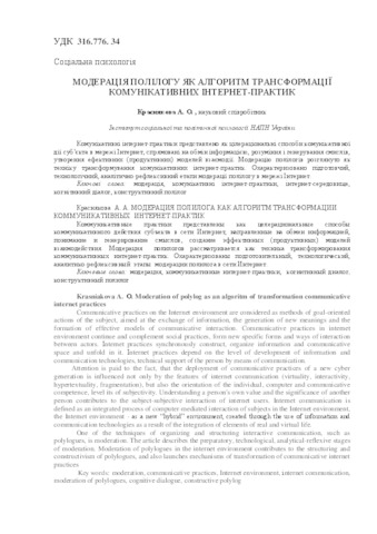 | Keywords: | moderation, communicative practices, Internet environment, іnternet communication, moderation of polylogues, cognitive dialogue, constructive polylog |