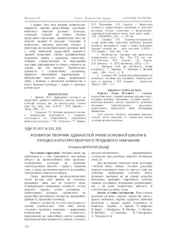 - Мачача, Тетяна Святославівна (2014) Development of creative abilities of secondary school pupils in the process of culture-labour training Наукові записки (131). pp. 128-131. ISSN ISBN 978-7406-57-8