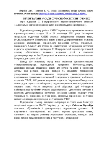 - Луценко, Л.М. and Ткаченко, К.О. (2011) bilingual principles of modern education of the deaf Лабораторія жестової мови Інституту спеціальної педагогіки НАПН України. pp. 1-9.