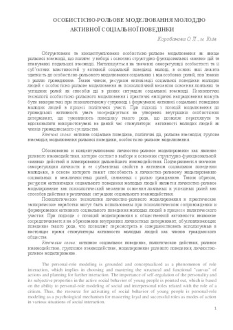 - Коробанова, О.Л. (orcid.org/0000-0003-3539-871X) (2017) Personal and role modeling of active social behavior by youth Наукові студії із соціальної та політичної психології, 40 (43). pp. 147-156. ISSN 2309-8287