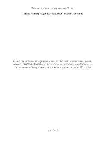 - Кільченко, А.В. (orcid.org/0000-0003-2699-1722), Вербельчук, Б.В. and Логвинюк, Я.М. (2019) Monitoring the web resource of the "Information Technologies and Learning Tools" with the help of Google Analytics: report for October-December 2018 [Experiment]