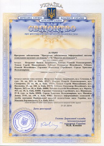Certificate on registration of copyright to work: Software "Software of Information System of Planning of Scientific Research" (IS "Scientific Research").