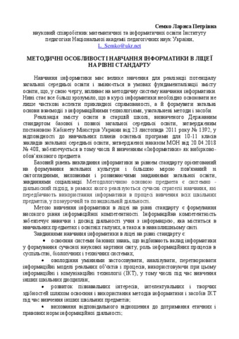 - Семко, Лариса Петрівна (2019) Methodical features of computer science education at the lyceum at the standard level In: ІІІ Всеукраїнська науково-практична Інтернет-конференція «Ресурсно-орієнтоване навчання в «3D»: доступність, діалог, динаміка»(18-22 лютого 2019 року) . КУЕП ПДАА, м. Полтава, Україна, pp. 406-410.
