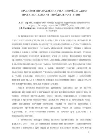 - Тарара, Анатолій Михайлович and Самійленко, С.І. (2014) Problems of introduction of effective methodology of design and technological activity of students Проектна діяльність учнів у системі компетентнісно спрямованої соціальної і життєвої практики в 11-річній школі та позашкільній освіті : матеріали Всеукраїнської науково-практичної конференції, 2. pp. 158-163.