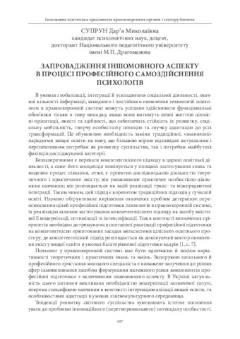 - Супрун, Д. М. (orcid.org/0000-0003-4725-094X) (2018) Introduction of a foreign language aspect in the process of professional self-realization of psychologists In: Іншомовна підготовка працівників правоохоронних органів і сектору безпеки: матеріали міжнародної науково-практичної конференції (24 квітня 2018 року) . Національна академія прокуратури України, м. Київ, Україна, pp. 107-108. ISBN 978-617-7500-49-9