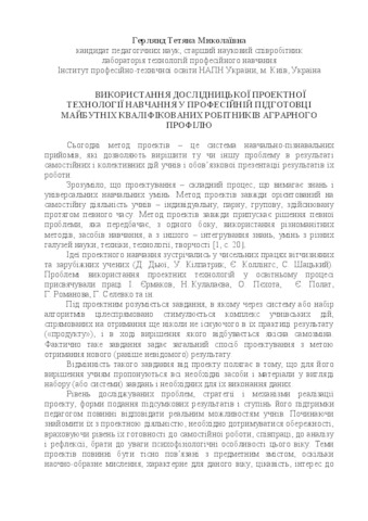 - Герлянд, Т.М. (2018) The use of research project technology training in the training of future qualified agricultural workers In: Технологія проектного навчання у професійній підготовці кваліфікованих робітників автотранспортної галузі: матеріали Всеукраїнської науково-практичної веб-конференції (м. Київ, 20 грудня 2018 року) . ІПТО НАПН України, м. Київ, Україна, pp. 26-30.