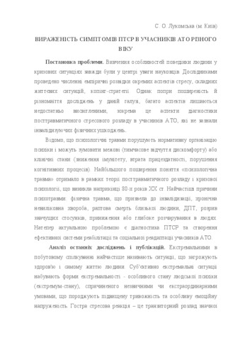 - Лукомська, Світлана Олексіївна (orcid.org/0000-0002-0360-6484) (2018) The severity of the symptoms of PTFE in participants of the ATO of different ages Post traumatik stress disorder: Adults, Children and Families in a War Situation, 2. pp. 132-143. ISSN 978-966-2760-83-5