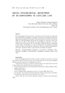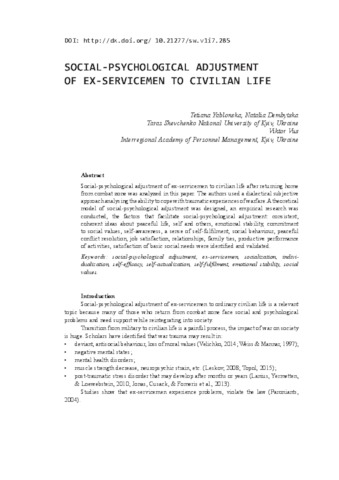 Social-psychological adjustment of ex-servicemen to civilian life after returning home from combat zone was analyzed in this paper. The authors used a dialectical subjective approach analysing the ability to cope with traumatic experiences of warfare. A theoretical model of social-psychological adjustment was designed, an empirical research was conducted, the factors that facilitate social-psychological adjustment: consistent, coherent ideas about peaceful life, self and others, emotional stability, commitment to social values, self-awareness, a sense of self-fulfilment, social behaviour, peaceful conflict resolution, job satisfaction, relationships, family ties, productive performance of activities, satisfaction of basic social needs were identified and validated.