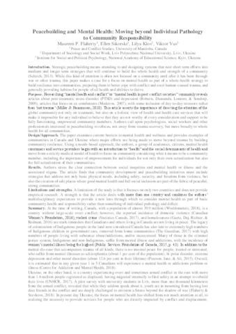 | Keywords: | mental health, community building, strategic peacebuilding, whole-health strategies, Canada, Ukraine |