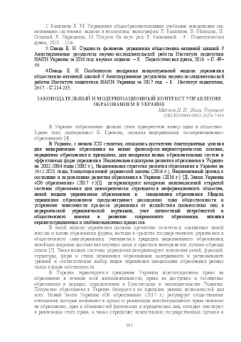 - Малюга, М.М. (orcid.org/0000-0003-2054-7444) (2018) Legislative and modernization context of education management in Ukraine In: Collection of materials of the international-practical conference "The psychology of impulse is an opportunity for action" , 1 (4). ТДПУ, м. Ташкент, Узбекістан, pp. 593-596.