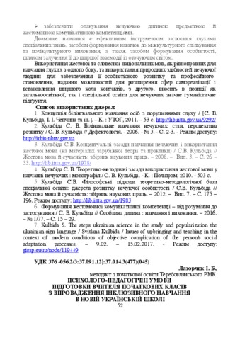 - Лазорчик, І.Б. (2018) Psychological and pedagogical conditions Preparation of elementary school teacher with the introduction of inclusive education in the new Ukrainian school Інклюзивне навчання в Новій українській школі: Матеріали міжнародної науково-практичної конференції “Інклюзивне навчання в Новій українській школі” (26 -27 березня 2018 р., м. Теребовля). pp. 52-56. ISSN 978-617-696-722-4