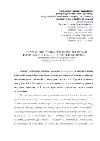 - Назаренко, Тетяна Геннадіївна (orcid.org/0000-0001-7354-5245), Шиліна, Н. В. and Усиченко, Наталія Дмитрівна (2019) Integrative learning technology as a means of forming the subject competencies Географія, 3-4 (367). pp. 39-49.