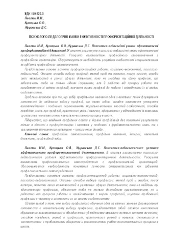 - Павлюк, М.М., Куницька, О.А and Журавська, Д.С. (2018) Psychological and pedagogical conditions of vocational guidance effectiveness Актуальні проблеми психології. сихологія особистості. Психологічна допомога особистості, 18 (11). pp. 244-259. ISSN 2072-4772