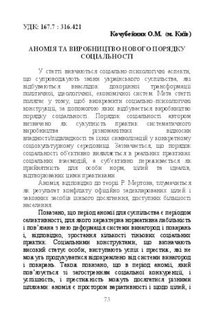- Кочубейник, Ольга Миколаївна (orcid.org/0000-0001-6460-8494) (2018) Аnomy and constructing of a new order of sociality Психологічні науки :проблеми і здобутки, 1 (11). pp. 73-90. ISSN 2522-4093