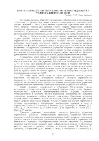 Formulation of the problem. Among the main tasks of the united territorial communities is the development of education in the conditions of decentralization, the establishment of reference educational institutions with the aim of providing quality educational services, creating conditions for the development of general secondary education, taking into account the needs of the united territorial communities (OTG), ensuring access of applicants for education to the use of different forms of learning, including distance learning, the participation of community members in public life.