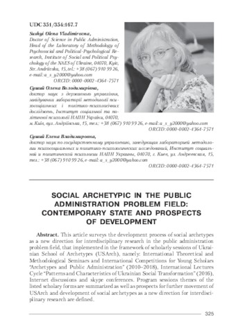 This article surveys the development process of social archetypes as a new direction for interdisciplinary research in the public administration problem field, that implemented in the framework of scholarly sessions of Ukrainian School of Archetypes (USArch), namely: International Theoretical and Methodological Seminars and International Competitions for Young Scholars “Archetypes and Public Administration” (2010–2018), International Lectures Cycle “Patterns and Characteristics of Ukrainian Social Transformation” (2016), Internet discussions and skype conferences. Program sessions themes of the listed scholary forms are summarized as well as prospects for further movement of USArch and development of social archetypes as a new direction for interdisciplinary research are defined. Attention is drawn to the fact that the post-soviet scholarly community doesn’t have a sufficiently developed opinion on social archetypes as an interdisciplinary field of research and its methodological foundations. The basis for criticism is an ambiguous attitude both to the teachings of K. Jung about the archetypes of the collective unconscious, and to the psychoanalytic trend as a whole. It is suggested that reducing the degree of critical attitude to social archetypes as an interdisciplinary field of research in the subject field of public administration depends on a number of conditions. Firstly, using the common formulation and interpretation of the ideas that influenced its formation and development. Secondly, from an adequate understanding of both the possibilities of social archetypes which are determined by its original methods of explanation and methods of analysis of subtle social phenomena which can serve as a key point for further theoretical and empirical research, and the theoretical and practical limitations of the archetypal approach. That is why social archetypes is positioned as an interdisciplinary research area. I argued that the social archetypes is not a universal scholarly apparatus and not an orthodox inheritance of the ideas of Jungianism. Finally, it is a methods that allows us to establish patterns and features of modern social development, the practical application of which expands the possibilities of public-management’s activity. At the same time, it is a metaphor through which the researcher is invited to plunge into the wider psychosocial and sociocultural context of social phenomenas and processes.