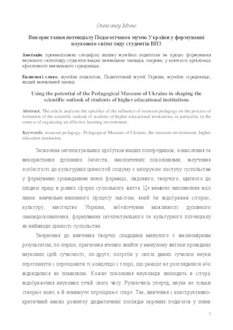 The article analyzes the specifics of the influence of museum pedagogy on the process of formation of the scientific outlook of students of higher educational institutions, in particular, in the context of organizing an effective learning environment.