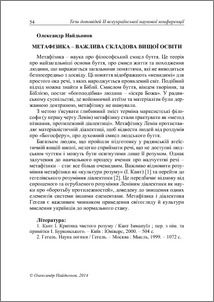 - Найдьонов, Олександр Григорович (2014) Метафізика - важлива складова вищої освіти In: Філософія як культурна політика сучасності . "Острозька академія", м. Острог, Україна, p. 54.