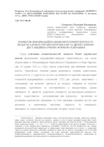 - Сидоренко, В.В. (2017) Development of information and digital competence of the teacher of the New Ukrainian school in a two-stage distance-learning form In: ІІ-а Всеукраїнська електронна науково-практична конференція «Відкрита освіта та дистанційне навчання: від теорії до практики» 30 листопада 2017 р. ДВНЗ «УМО» НАПН України . ДВНЗ «Університет менеджменту освіти» НАПН України, м. Київ, Україна, pp. 30-43.